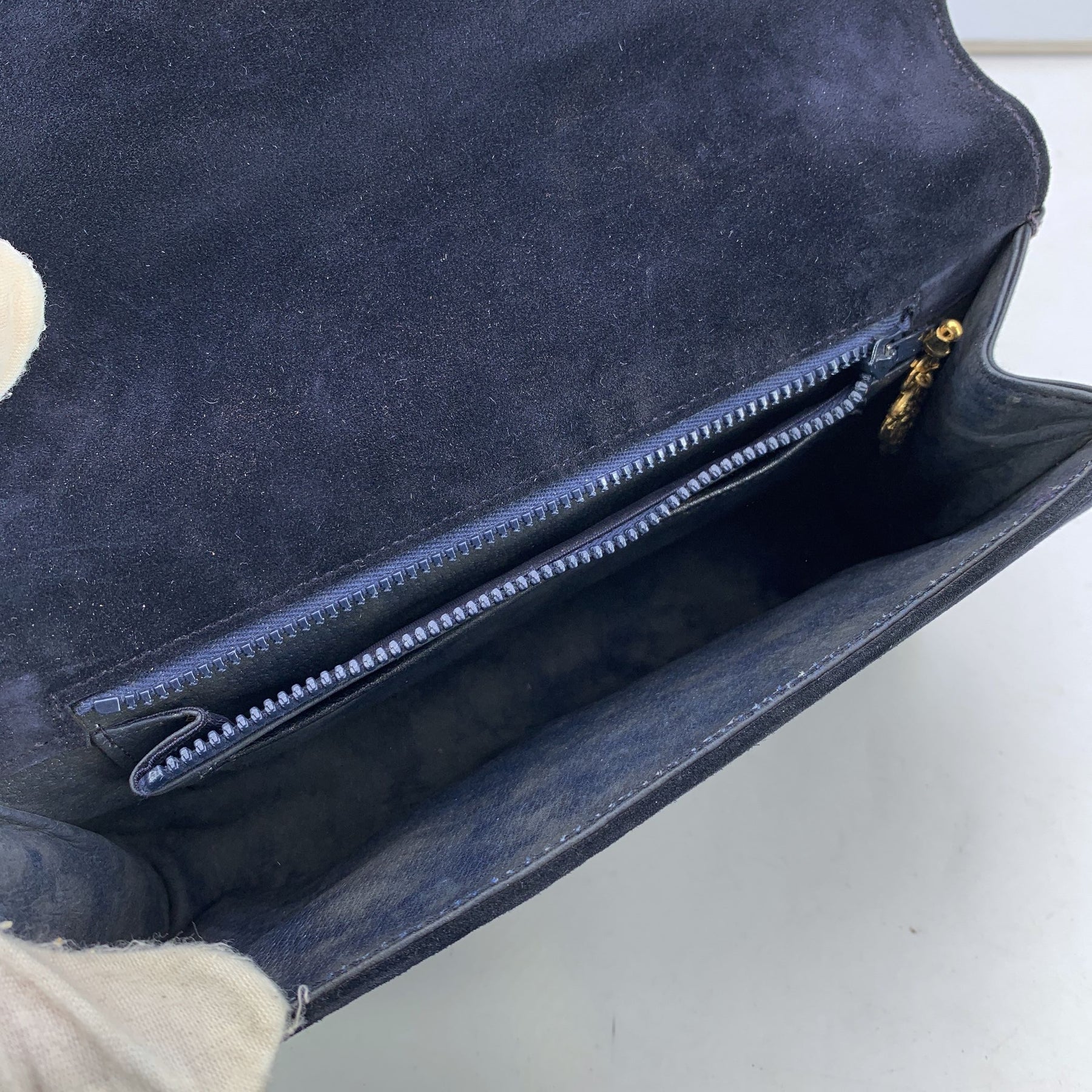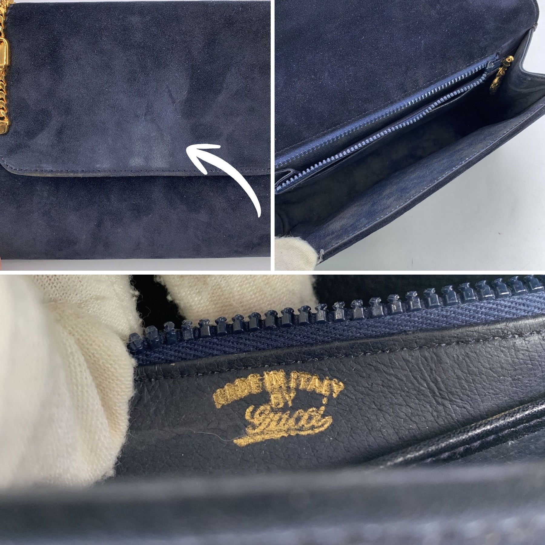 Gucci Vintage Blue Suede Gold Chain Clutch Pochette Handbag